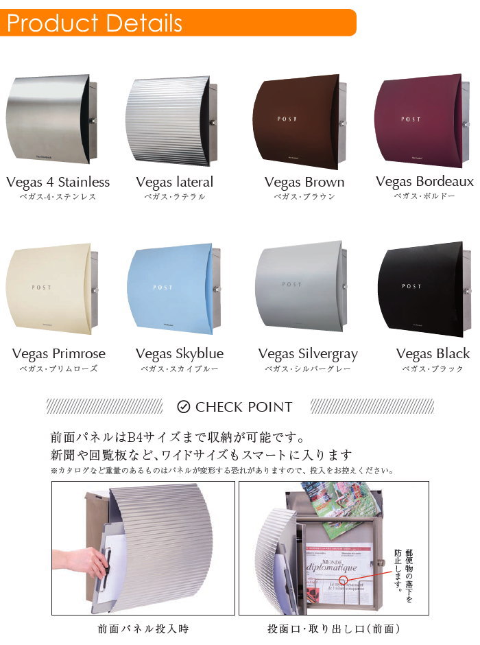 商 品 詳 細商品名郵便受け マックスノブロック 壁掛け型 Vegas.4ステンレス(ベガス)サイズW390×H375×D205mm 投入口:W330×D30mmカラーステンレス仕様壁付けポスト(上入れ前出し)/鍵:レバーハンドル(標準)/開閉・鍵方向選択※標準のレバーハンドルには南京錠(お客様別途ご用意/シャフトφ6.5〜7mm)で施錠が可能材質【本体】ステンレスヘアライン仕上げ【パネル】アルミ/パウダーコーティング備考送料無料:※北海道・沖縄・離島除く ※画像は使用するブラウザにより色が違って見える場合があります。