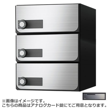 (横開き) 前入後出/屋内タイプ 横開き 3戸 アナログカード錠 ステンレスヘアーライン 扉・投入口:ヘアーライン仕上 アクリル焼付塗装 本体:PC/ABS樹脂難燃グレード 扉:ステンレス(SUS304) PC樹脂 投入口:ステンレス(SUS304) サイズ(H×W×D) 360×280×423.2 6.1kg KS-MB6102PY-3K-S ※画像はイメージです。